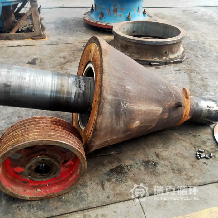 动锥部主要对主轴下部及轴套安装部位进行抛光处理,以适应新铜套磨合,上部轴套换新,参与运行的各零部件及密封都要更换,保证主机运行平稳且不漏油。主机皮带轮抛光处理,动锥衬板更换新件。