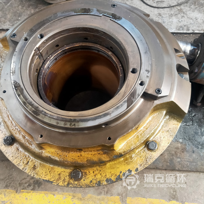 架体铜套磨损严重,偏心铜套烧伤,更换架体铜套及偏心铜套,活塞内外壁光滑无需处理,偏心套部正常磨损尺寸复检合格无缺陷可以继续使用。大小齿轮接触率符合要求可继续使用,其余外观处理做好装机前准备。